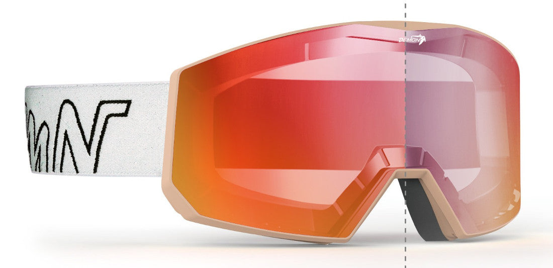 DMN ha creato la maschera da sci definitiva perfetta per l’utilizzo in tutte le condizioni di luce tipiche della montagna nella stagione invernale per chi ha la necessità di indossare i propri occhiali da vista: La lente cambia le caratteristiche di trasmissione rimanendo perfetta per aumentare il contrasto e il comfort. Quando il cielo è coperto o la pista è poco illuminata, o si è entrati in zona boschiva, la lente risulta ad alto contrasto. Mente all’esposizione solare generano reazione chimica diventando scura permettendo all’occhio di adattarsi al meglio per la visione perfetta del percorso.