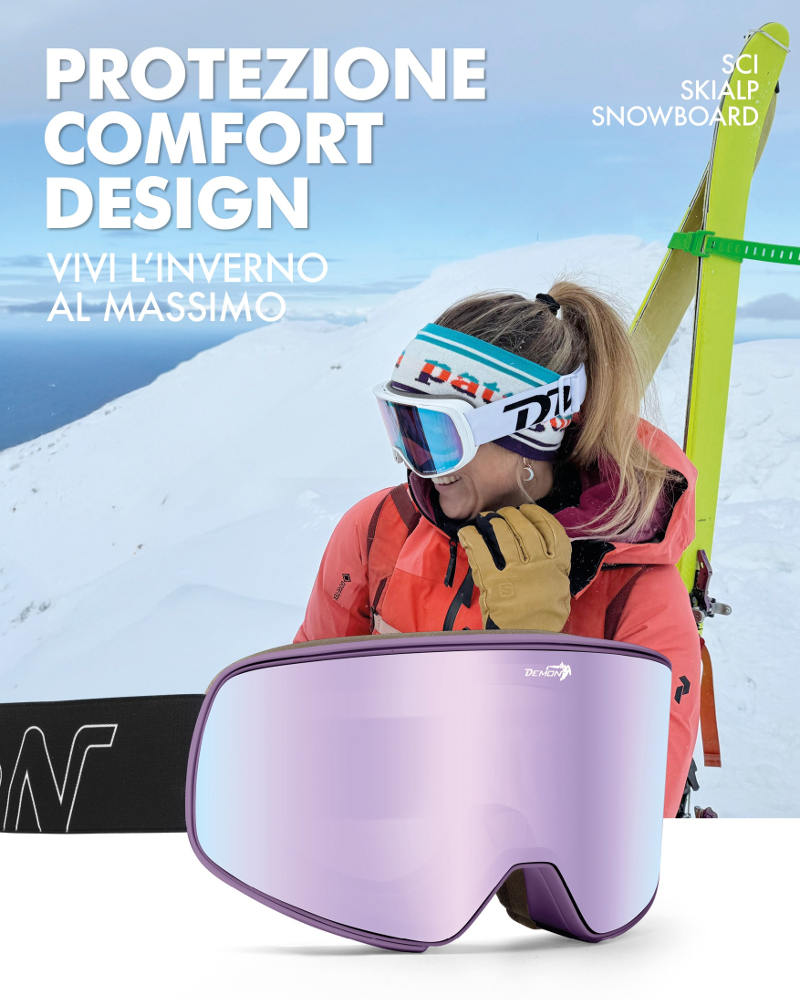 - Lente doppia con trattamento antiappannante: Grazie alla combinazione con un avanzato sistema di ventilazione integrato nella montatura, questa tecnologia previene efficacemente la formazione di condensa all'interno della maschera, mantenendo la visione sempre chiara e priva di fastidiosi appannamenti, anche nelle condizioni più umide o durante intense sessioni di sci.
